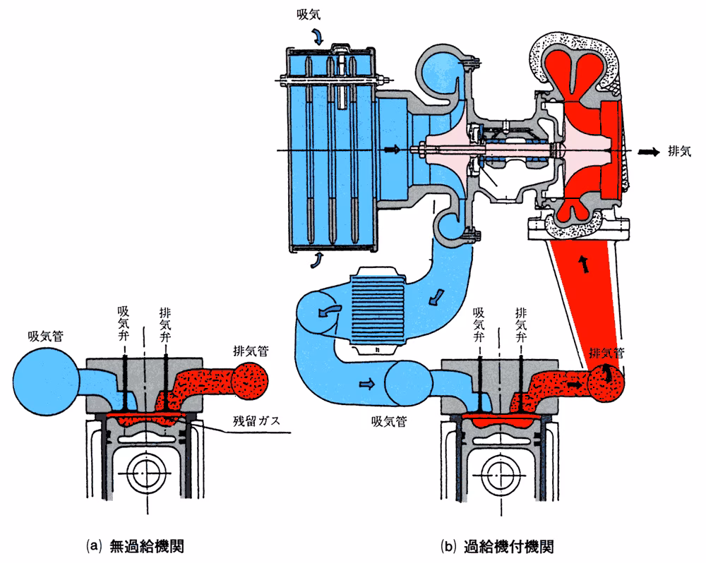 排気ガスのエネルギーを利用して過給することで、エンジンの出力を向上させます。